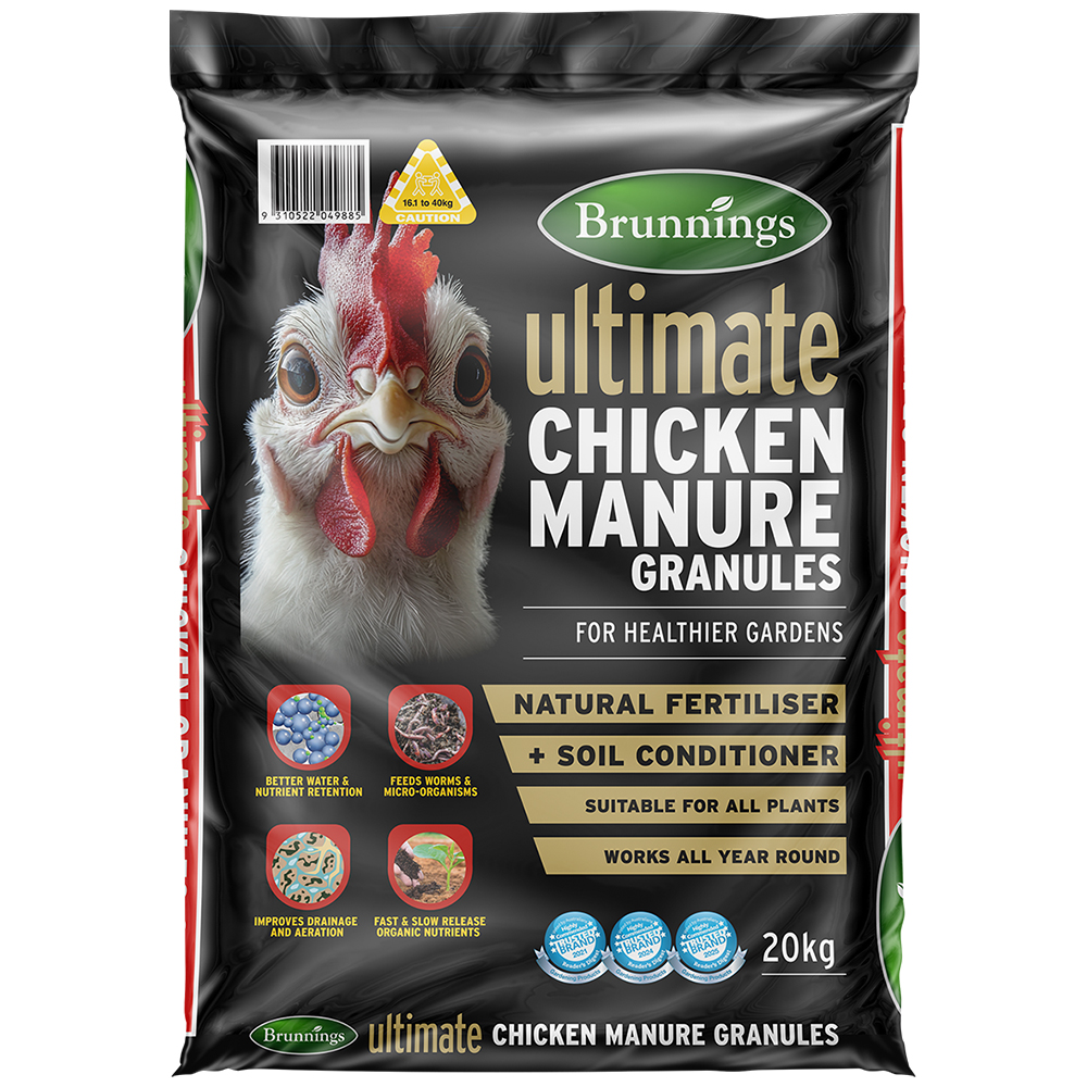 Brunnings Ultimate Chicken Manure Granules offers both immediate nutrient release and will then continue to slowly feed plants for months.