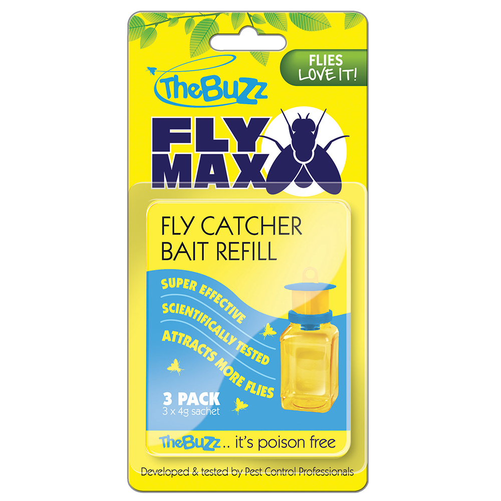 The Buzz FlyMax Fly Catcher Bait Refill is a super effective fly attractant developed by professionals. They are non-toxic and poison free and lure flies into the catcher so they can be destroyed.