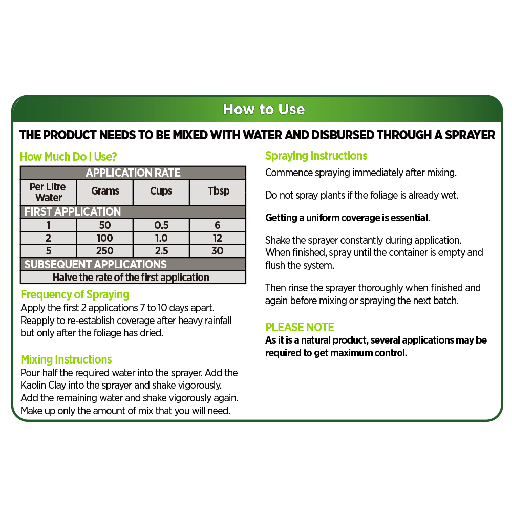 For best results, Kaolin Clay should be applied to plants prior to the emergence of adult insects.