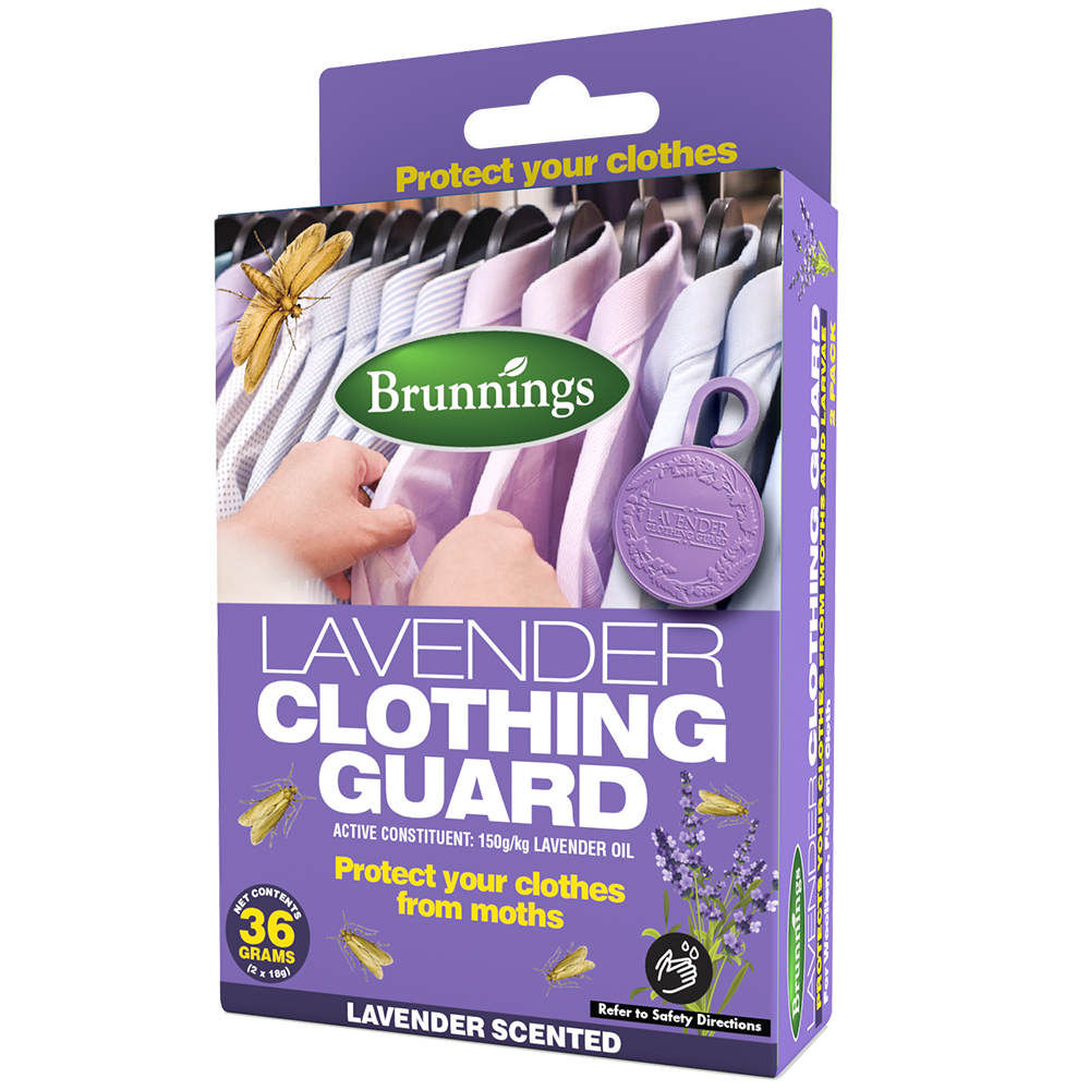 The Brunnings Lavender Clothing Guard is an easy to use, lavender fragranced hanging disk that is an effective clothing moth repellent that can be used around the home. Simply hang the Lavender Clothing Guard with its convenient hang hook in your wardrobe or closet or simply throw into a drawer. The disk has been impregnated with a lavender fragrance that not only repels damaging clothing moths but leaves clothes smelling fresh. Use one Lavender Clothing Guard disc per 3m³ maximum. The Lavender Clothing Guard disc remains effective for up to 2 months.