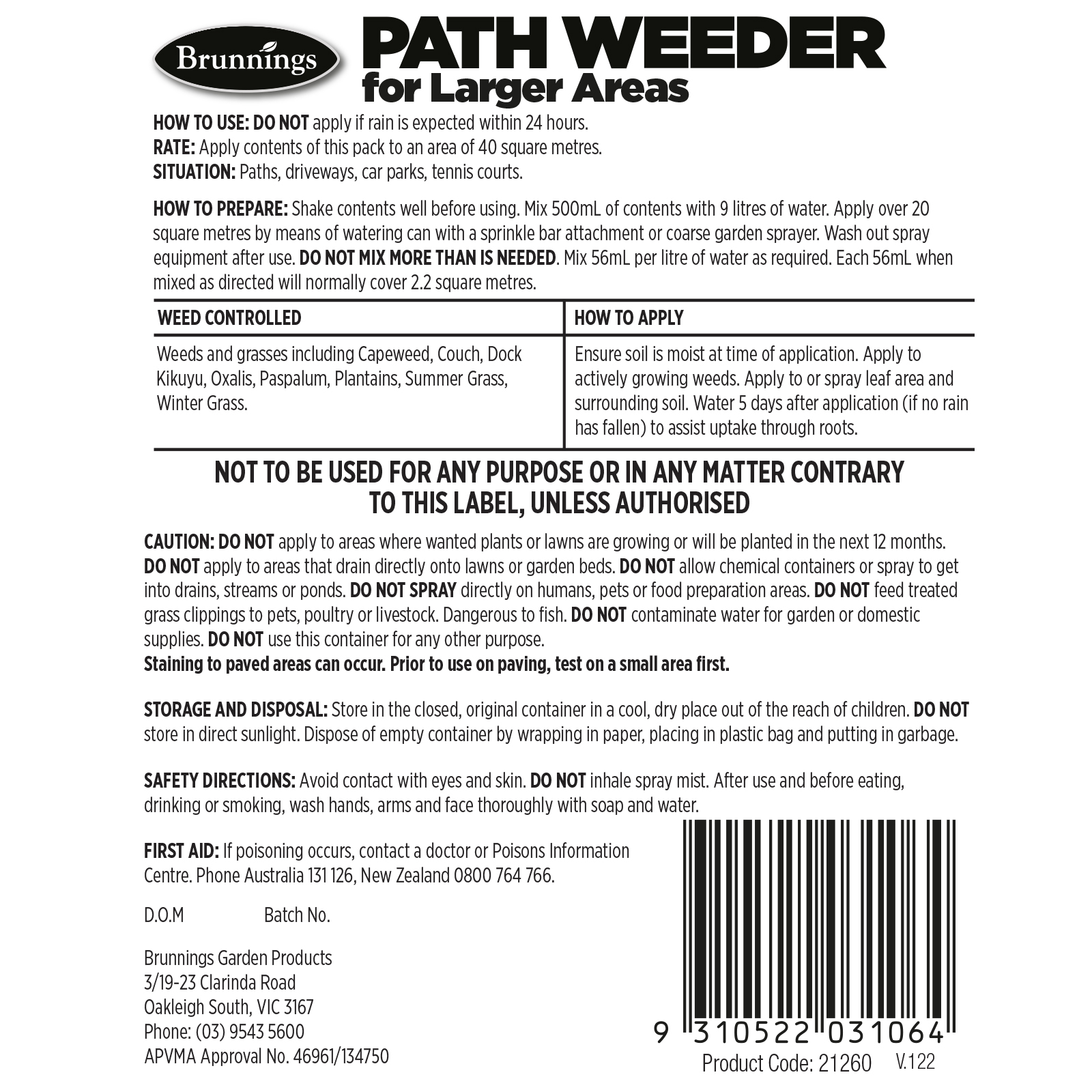Brunnings Path Weeder Concentrate is ideal for killing and controlling most weeds and grasses on paths, driveways, tennis courts and car parks.