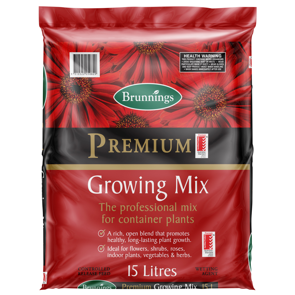 Brunnings Premium Growing Mix has been developed by horticultural experts especially for potting indoor and outdoor container plants.